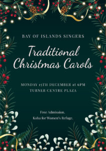 Time to exercise those vocal cords! Come and join the Bay of Islands Singers and Turner Centre for the 2025 Christmas Carols. An opportunity to join together and sing traditional carols and celebrate the start of the Christmas Season. We look forward to seeing and hearing you on Monday 15th December at 6pm.